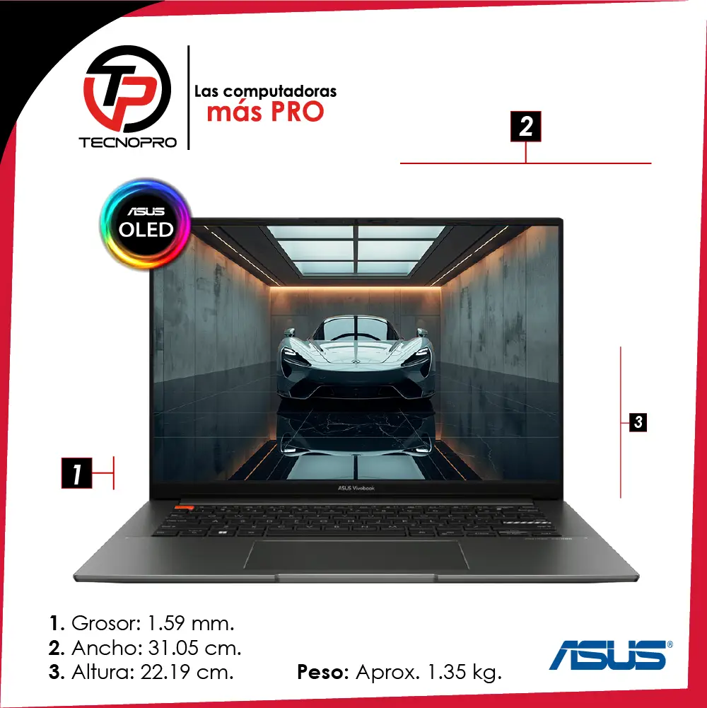 – Pantalla: 14″ 2.8K (2880×1800) OLED 16:10 relación de aspecto, Panel de frecuencia, 120Hz de tasa de frecuencia , 400 nits, 600 nits, DCI-P3: 100 %, 1,000,000:1, VESA CERTIFIED Display HDR True Black 600