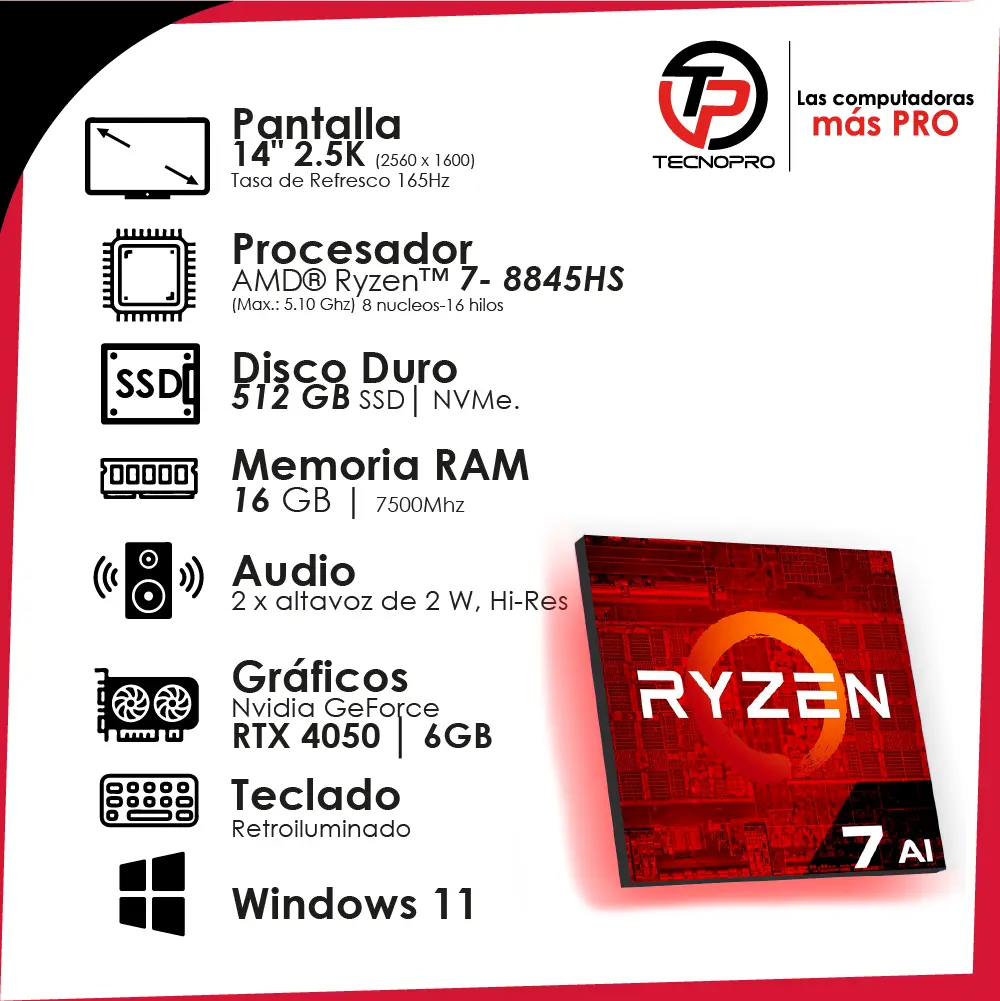 – Procesador: AMD Ryzen™ 7 8845HS (3.8 GHz; Frecuencia turbo máxima 5.1 GHz)