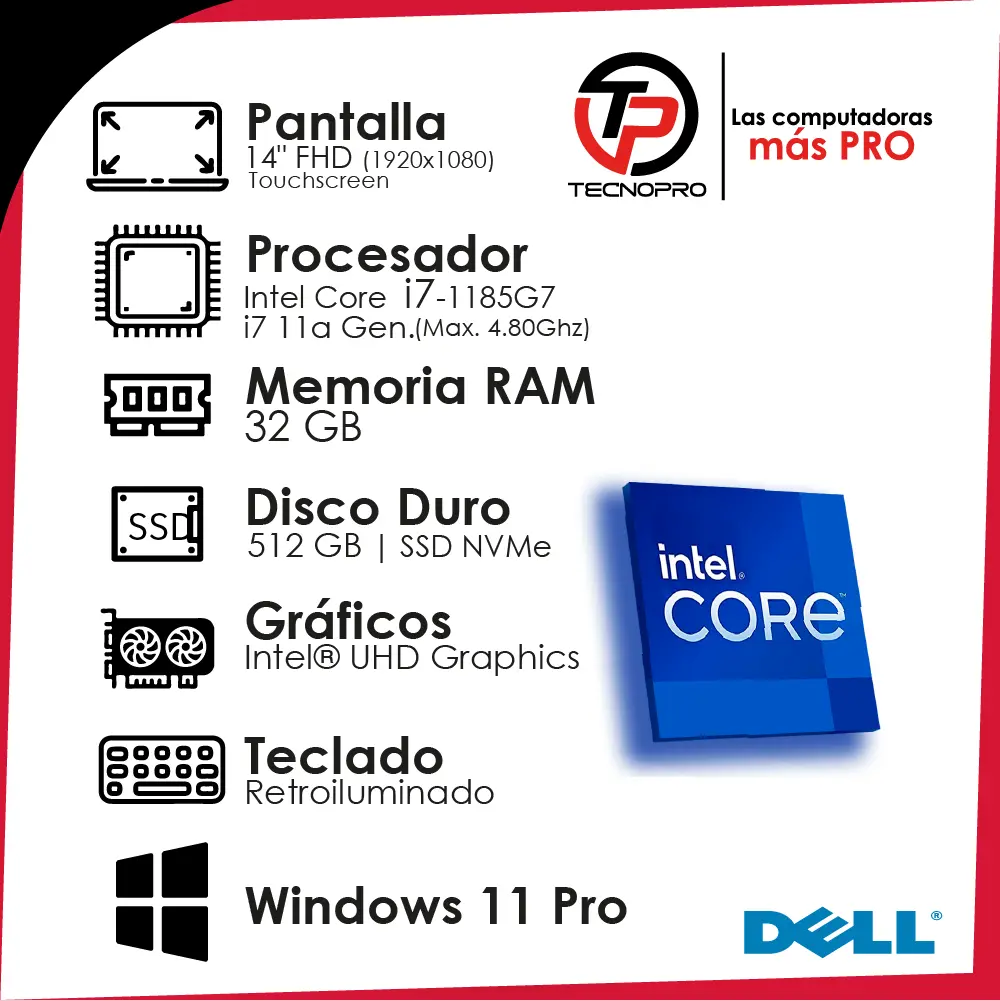 – Procesador: Intel® Core™ i7-1185G7 (1,90 GHz; Frecuencia turbo máxima 4.80 GHz)