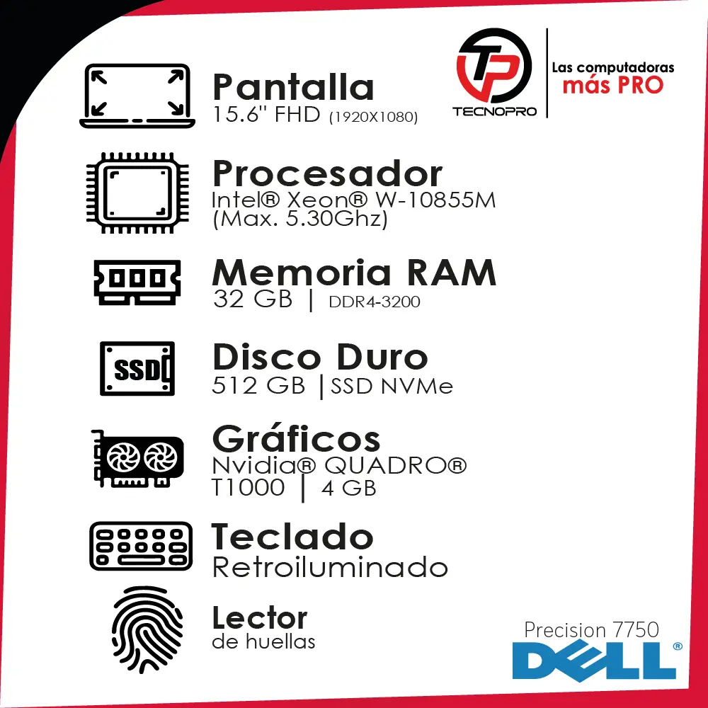 – Procesador: Intel Xeon W-10885M (2.40 GHz; Frecuencia turbo máxima 5.30 GHz)
