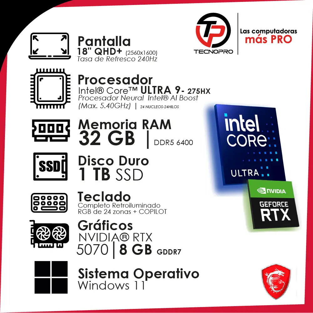 – Procesador: Intel® Core™ Ultra 9 275HX (Frecuencia turbo máxima del Performance-core 5.4 GHz; Frecuencia turbo máxima de Efficient-core 4.6 GHz) 24 Núcleos