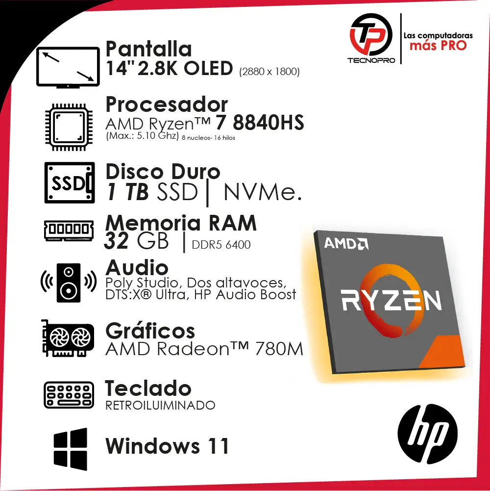 – Procesador: AMD Ryzen™ 7 8840HS (3.30 GHz; Frecuencia turbo máxima 5.10 GHz) 8 Núcleos