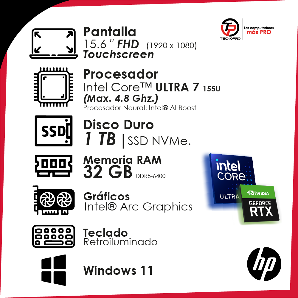 – Procesador: Intel® Core™ Ultra 7 155U (Frecuencia turbo máxima del Performance-core 4.8 GHz; Frecuencia turbo máxima de Efficient-core 3.8 GHz) 12 Núcleos