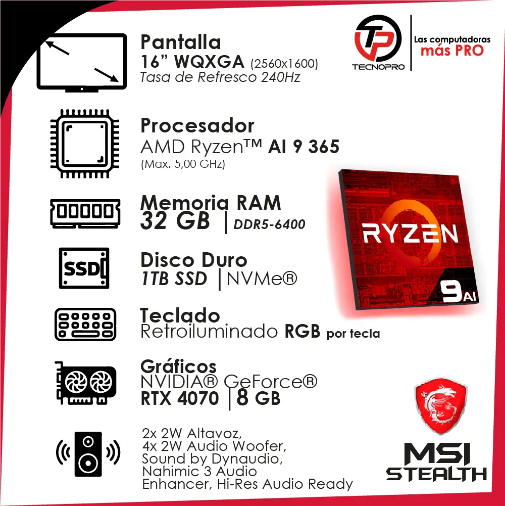 Laptop Msi Gamer Stealth A3HVGG A16 AI+ Ryzen Ai 9 – 32gb Ram – 1tb Ssd + Rtx 8 Gb
