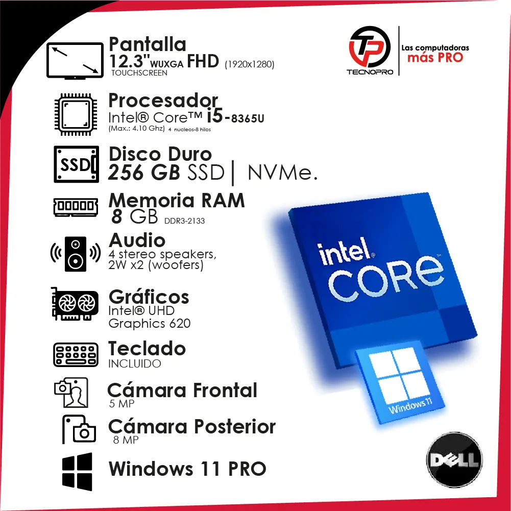 Tablet Dell Windows Core I5 – 8 Gb Ram – 256 Gb Ssd + Touch Negro